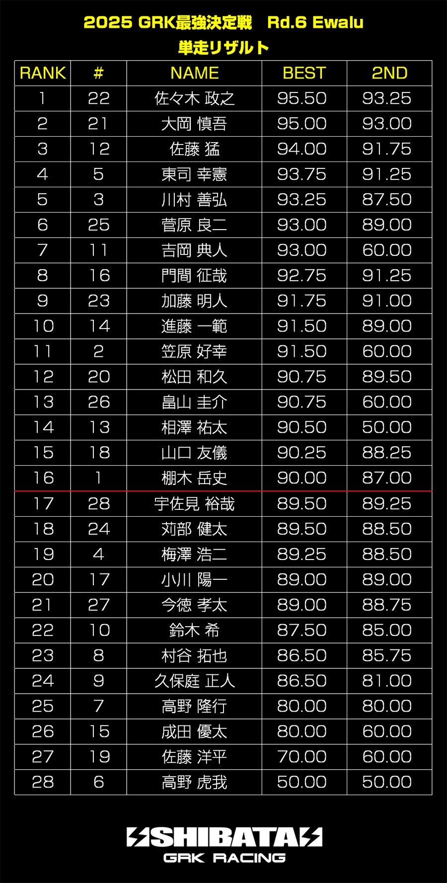 6 | 25 | 菅原 良二 | 93.00 | 89.00 |