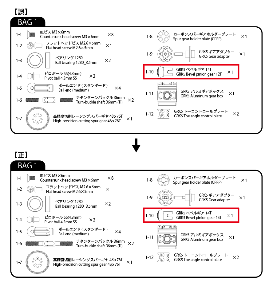 「1-10 GRK5 ベベルギア 14T」の英語表記が「GRK5 Bevel pinion gear 12T」となっておりましたが、正しくは「GRK5 Bevel pinion gear 14T」となります。